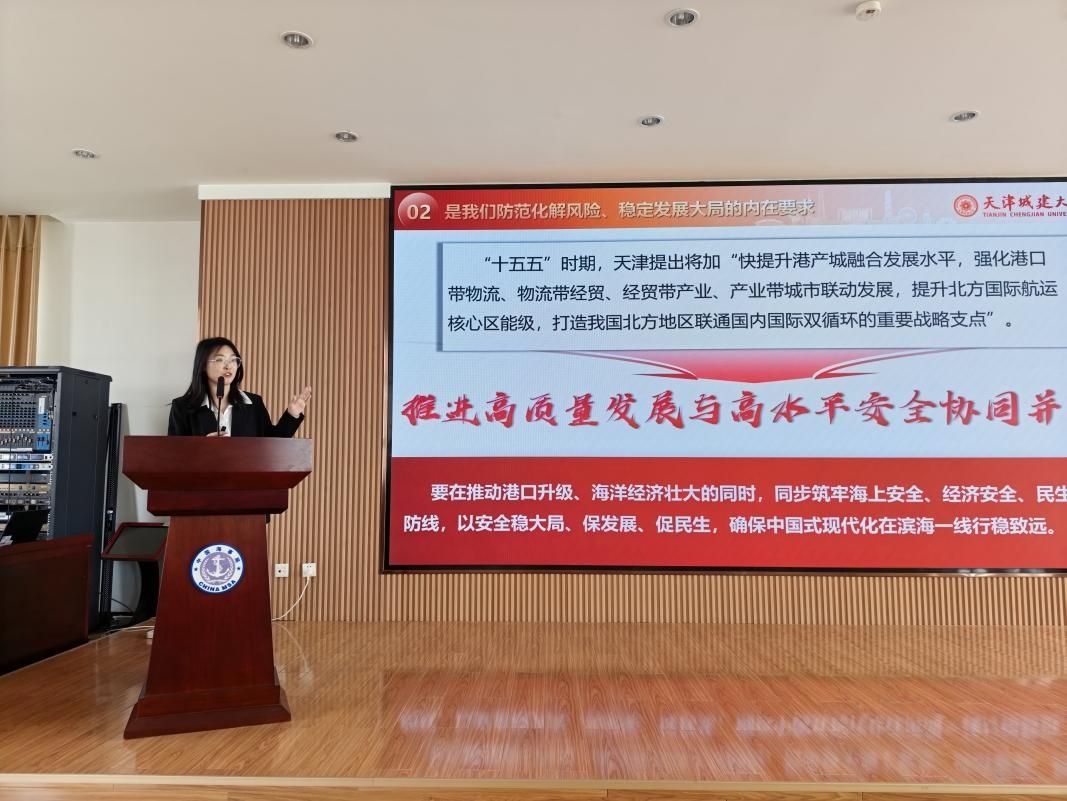 揭牌仪式后,天津城建大学思政课教师崔梦影现场讲授了题为《统筹发展和安全 护航“十五五”新征程》的微课程。她结合国际航运风险与天津港的枢纽角色,阐释了守护海上国门、保障战略通道的现实意义。“海上安,城市安;海事安,大局稳。”崔梦影说,港口安全不仅是国家战略的体现,也直接关系到城市的经济发展与民生稳定。