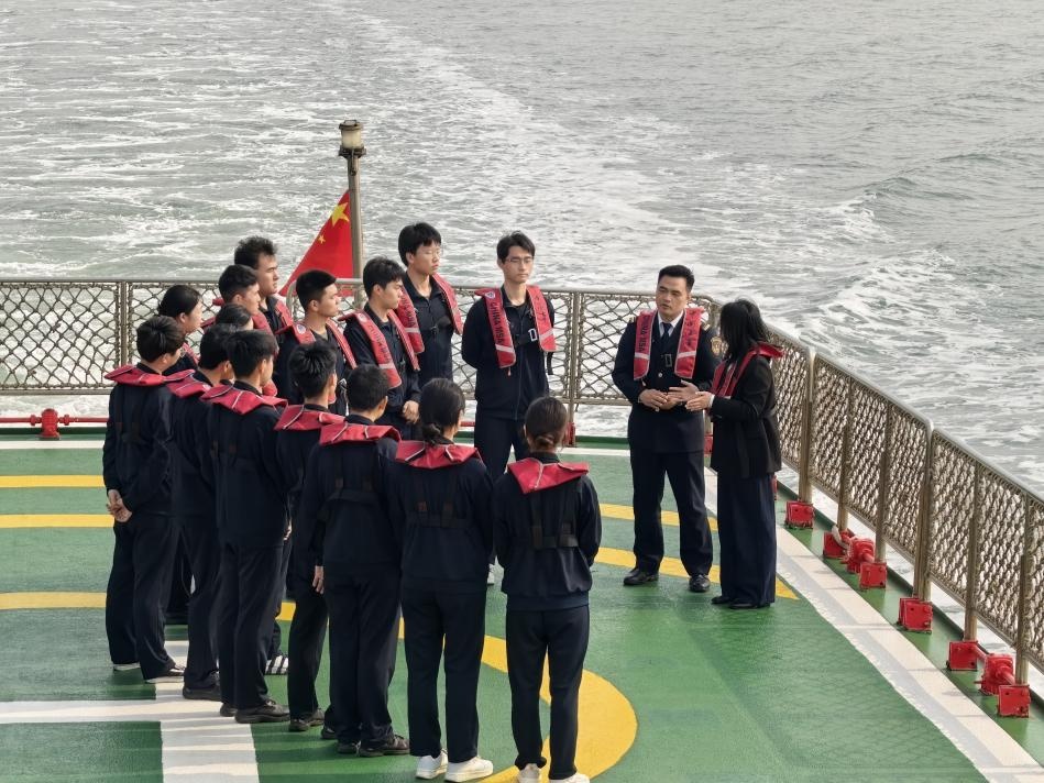 崔梦影则从城市发展视角进行引导:“大家看,眼前这些往返的巨轮,正是城市经济的生命线。每一次安全巡航,都是对国家经济安全的一次守护。”海风之中,抽象的国家安全概念化为可触可感的场景:脚下的甲板、眼前的海域、耳边的轮机声,共同构成了一堂真实可感的“大思政课”。