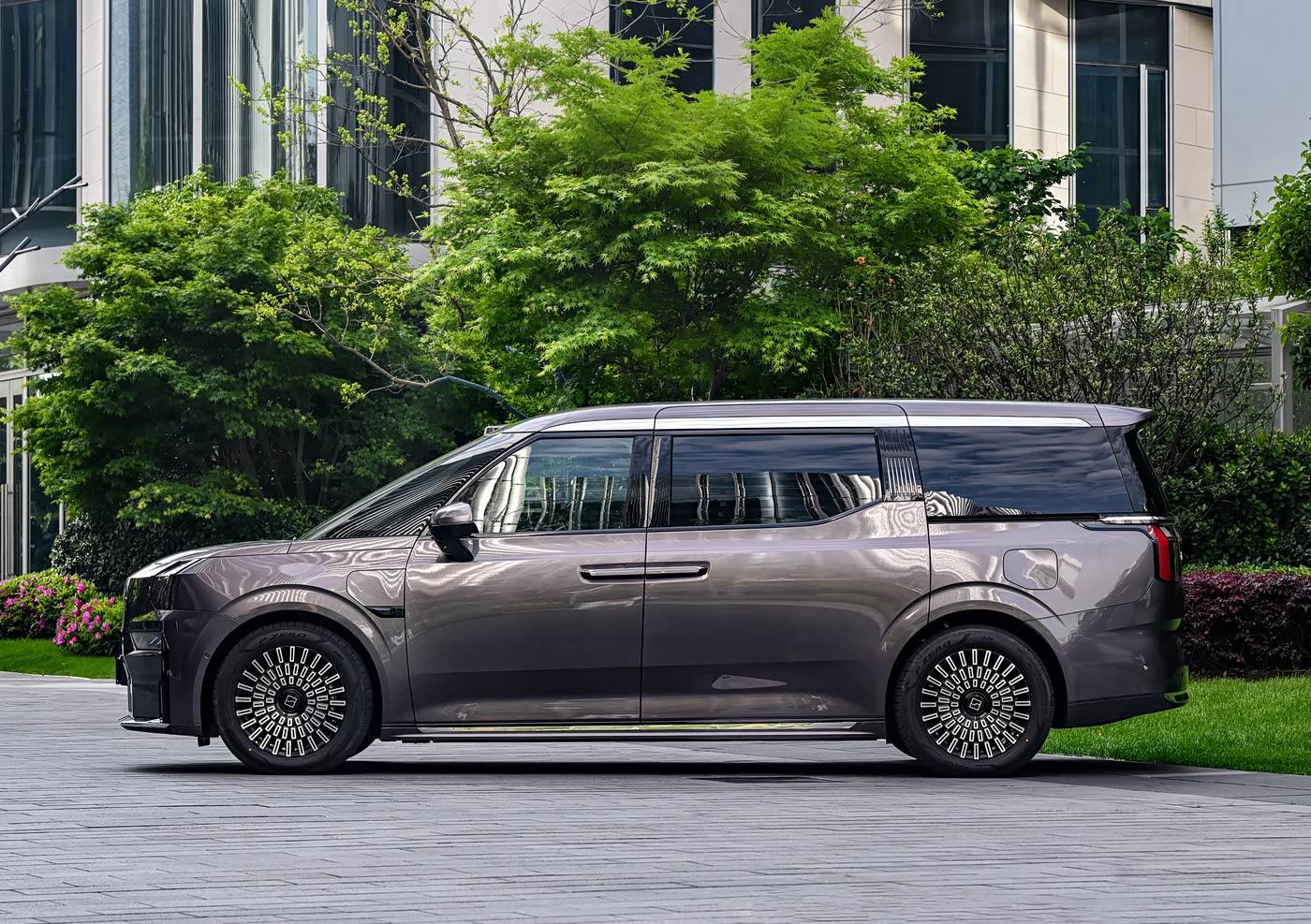 再来看车身侧面部分,车身侧面延续了方正硬朗的MPV标准轮廓,5217×2024×1812mm的车身尺寸搭配3205mm超长轴距,不仅为内部空间奠定了基础,更营造出大气稳重的姿态。19英寸大轮毂与悬浮式车顶设计,巧妙融合了运动感与豪华感,让这款大型MPV摆脱了臃肿感,同时降低了高速电耗,提升了行驶稳定性。流畅自然的腰线从前翼子板延伸至车尾,勾勒出优雅的轮廓。车门采用常规门把手设计,没有任何学习成本,后门配备的电动门,只需按压门把手上的按键便能开启,尽显便捷。车身侧面还配备了后向辅助驾驶摄像头、侧向环视摄像头等,进一步完善了智能驾驶的感知体系。